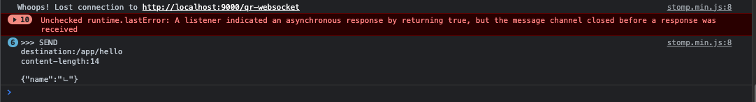 @Configuration @ComponentScan(basePackageClasses = [WebSocketConfig::class]) @EnableWebSocketMessageBroker class WebSocketConfig : WebSocketMessageBrokerConfigurer { override fun registerStompEndpoints(registry: StompEndpointRegistry) { registry.addEndpoint("/qr-websocket").setAllowedOriginPatterns("*").withSockJS() } override fun configureMessageBroker(config: MessageBrokerRegistry) { config.setApplicationDestinationPrefixes("/app") config.enableSimpleBroker("/topic") } @Bean fun createWebSocketContainer(): ServletServerContainerFactoryBean { val container = ServletServerContainerFactoryBean() container.setMaxSessionIdleTimeout(30 * 1_000) //in milliseconds return container } }10초 동안 클라이언트에서 응답이 없으면 끊어지게 됩니다.
