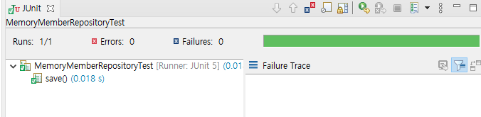 package hello.hellospring.repository; import org.junit.jupiter.api.Test; public class MemoryMemberRepositoryTest { MemberRepository repository = new MemoryMemberRepository(); @Test public void save() { } }Run As -> JUnit Test를 실행하게 되면 아무것도 없기 때문에 당연히 테스트에 오류가 발생하지 않습니다.