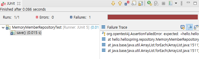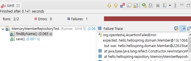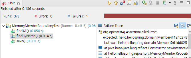 assertThat(result). isEqualTo(member1); 구문을 실행하면 에러가 발생할 것입니다.