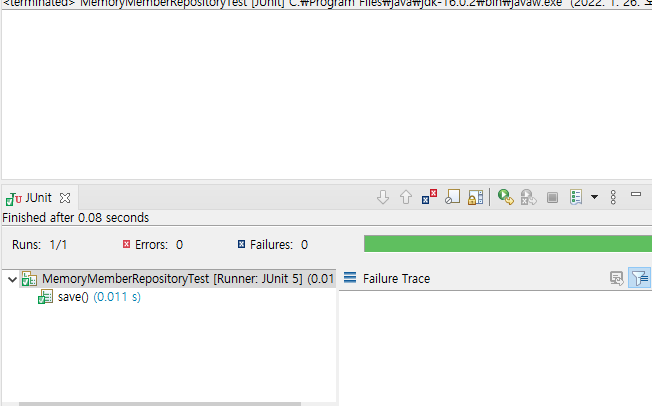 3. MemoryMemberRepositoryTest.java 파일에 아래와 같이 입력하고 실행해봅니다.
