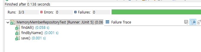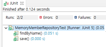 package hello.hellospring.repository; import org.junit.jupiter.api.Test; import static org.assertj.core.api.Assertions.*; import hello.hellospring.domain.Member; public class MemoryMemberRepositoryTest { MemberRepository repository = new MemoryMemberRepository(); @Test public void save() { Member member = new Member(); member.setName("Spring"); repository.save(member); Member result = repository.findById(member.getId()).get(); assertThat(member).isEqualTo(result); } @Test public void findByName() { Member member1 = new Member(); member1.setName("Spring1"); repository.save(member1); Member member2 = new Member(); member2.setName("Spring2"); repository.save(member2); Member result = repository.findByName("Spring2").get(); assertThat(result).isEqualTo(member1); } }위에서 했던 것과 동일하게