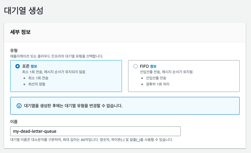 - FIFO 큐의 DLQ는 그것도 FIFO 큐여야 한다. 마찬가지로 Standard 큐의 DLQ는 Standard 큐여야 한다.
