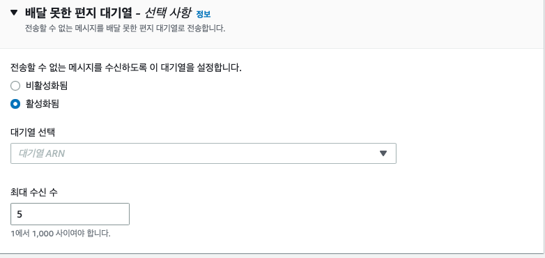 - 메시지 최대 보간기간은 원래 Queue의 보관기간보다 길어야 한다.