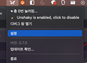 메뉴바에서 Unshaky > 설정