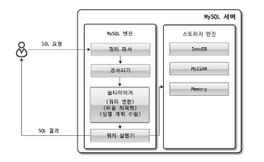 쿼리 파서, 전처리기, 옵티마이저 등으로 구성되어 있으며 옵티마이저가 MySQL의 두뇌를 담당합니다.