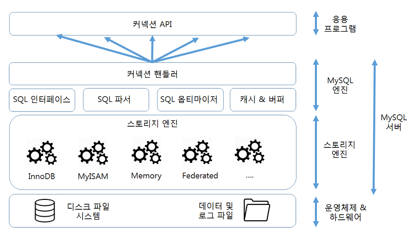 CREATE TABLE test_table (fd1 INT, fd2 INT) ENGINE=INNODB;이후 CRUD 작업이 발생하면 InnoDB 스토리지 엔진이 해당 처리를 담당하고, 각 스토리지 엔진은 성능향상을 위해 버퍼풀(InnoDB), 키 캐시(MyISAM)와 같은 기능을 내장하고 있습니다.