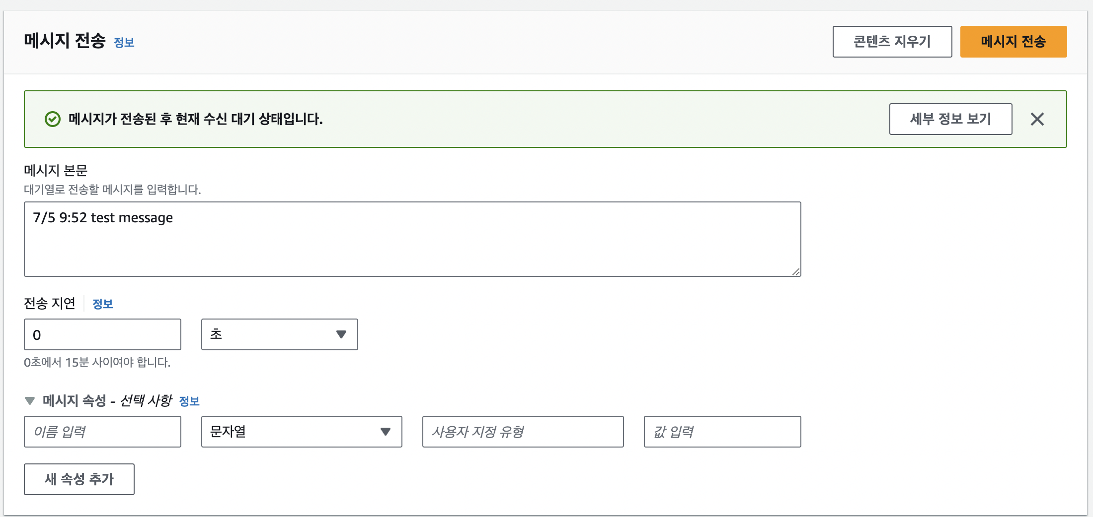 1대의 Instance를 띄우고 하나의 SQS에 테스트 메시지 전송