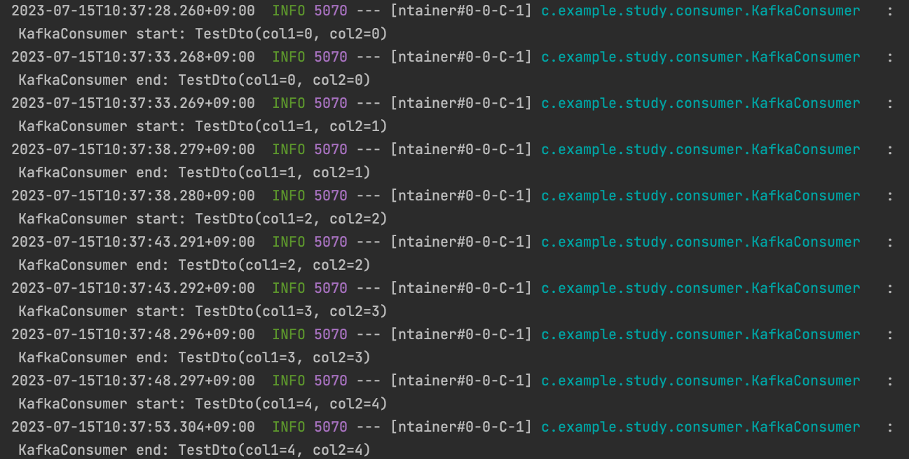 @Component class KafkaConsumer { val logger = KotlinLogging.logger {} @KafkaListener( topics = ["test"], groupId = "#{ T(java.util.UUID).randomUUID().toString() }", containerFactory = "myContainerFactory" ) fun consume( @Payload payload: TestDto, acknowledgment: Acknowledgment, ) { logger.info("KafkaConsumer start: $payload") sleep(5000) logger.info("KafkaConsumer end: $payload") acknowledgment.acknowledge() } }sleep을 통해 5초의 처리시간을 가지고, 이후에 acknowledgement를 통해 다음 메시지를 가져옵니다.