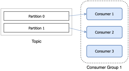 예를 들어 위의 그림을 예시로 보면 topic에 partition은 2개인데 consumer를 3개로 늘려봤자 consumer3은 놀고 있게 됩니다.