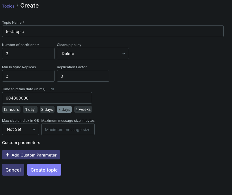 안정성을 위해 Replication Factor는 3개, Min In Sync Replicas는 2로 설정하였습니다.