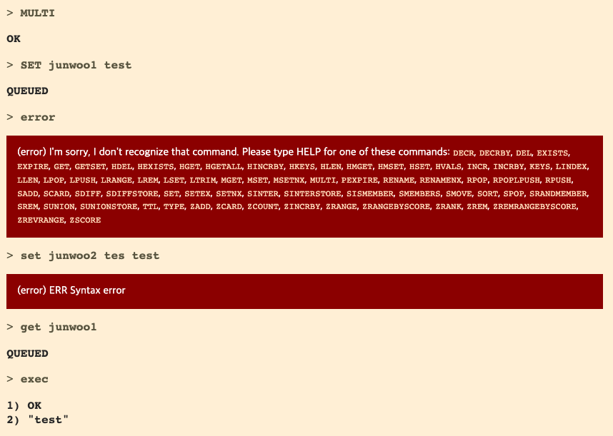 >> MULTI # 트랜잭션의 시작을 명시 "OK" >> SET junwoo1 test # junwoo1이라는 key에 test라는 value를 저장 "QUEUED" >> SET junwoo2 test "QUEUED" >> GET junwoo1 # GET은 어떻게 처리되는지 확인 "QUEUED" >> EXEC # QUEUED 된 명령어를 실행한 후 결과를 전부 출력 1) "OK" 2) "OK" 3) "test" # GET 또한 바로 처리되지 않고 QUEUED 된 후 EXEC 했을 때 처리각 메시지는 큐에 저장(QUEUED)되고 exec 명령어와 동시에 실행됩니다.