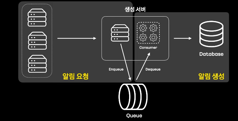 알림 요청과 알림 생성이 여전히 분리되었고, 생성 서버가 다운되거나 재시작하더라도 Message Queue에서 Kafka라면 로그로 Disk로 저장되기 때문에 더 이상 데이터는 유실되지 않습니다.