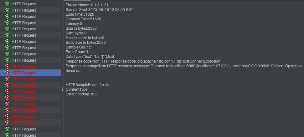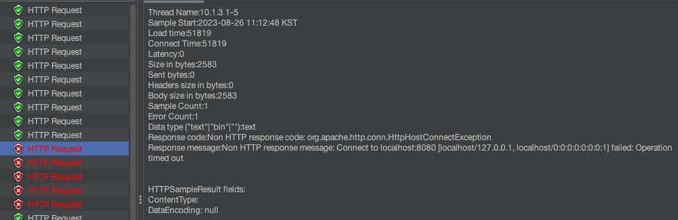 server: tomcat: threads: max: 1 # 생성할 수 있는 thread의 총 개수 accept-count: 1 # 활성 스레드가 없을 때 대기열의 개수 max-connections: 1 #연결할 수 있는 Connector 수9건은 실패할 것으로 예상했지만 예상과는 다르게 Connect Time이 50초가 초과된 경우에만 timeout이 발생합니다.