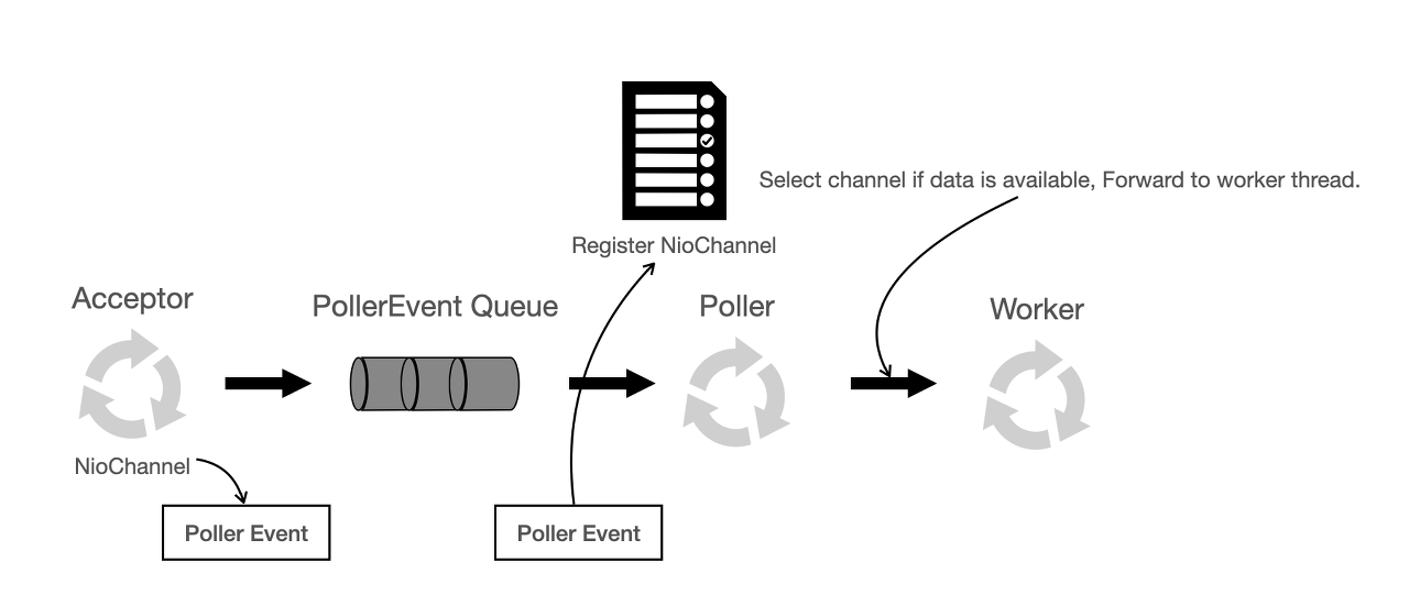 Selector에 PollerEvent에서 받은 Chaanel을 등록하며, select() 동작으로 데이터를 읽을 수 있는 소켓을 얻고, Worker Thread Pool에서 이용할 수 있는 Woker Thread를 얻어 해당 소켓을 넘깁니다.