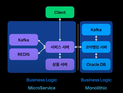 토스 뱅크의 아키텍처 마이크로서비스의 장점을 가져와서 서비스서버와 코어뱅킹서버를 각각 독립된 API 서비스로 정의하여 독립된 서비스가 비즈니스 로직을 처리할 수 있도록 하였습니다.