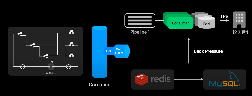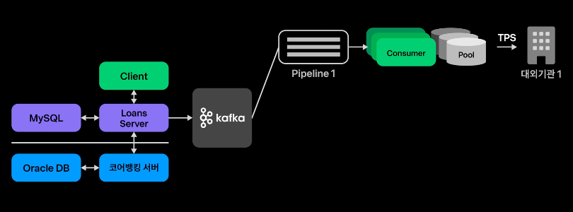 Kafka를 통해 고객의 요청은 파이프라인에 도달되고 Consumer에는 메시지를 처리할 수 있는 독립된 Thread Pool을 설정하고 대외기간의 상태에 따라 상이하며, 대외기관이 알려준 기본성능으로 세팅되어 있습니다.