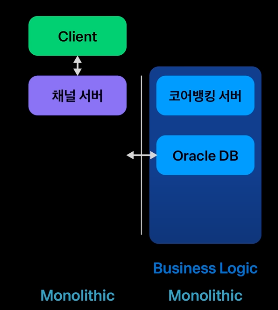 전통 금융 회사 아키텍처 전통금융회사는 비즈니스 로직이 계정계라 불리는 모놀리식 코어뱅킹에서 구현됩니다.