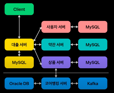 사용자 서버, 약관 서버, 상품 서버, 대출 서버마다 독립된 스키마를 가지기 때문에 복잡도가 올라가게 됩니다.