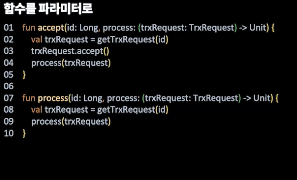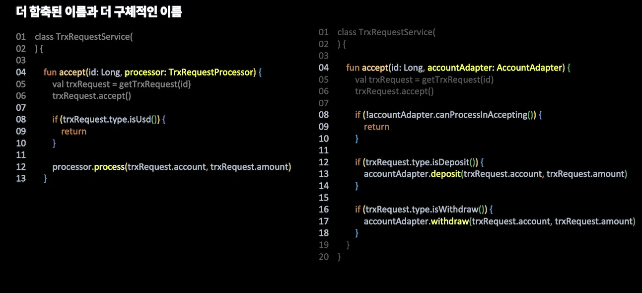 트레이드오프의 개념이고 왼쪽에서는 process란 이름으로 조금 더 포괄적인 다른 기능을 추가할 수 있다면, 오른쪽의 코드는 행위를 명확하게 정해놓았다고 볼 수 있습니다.