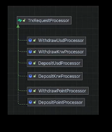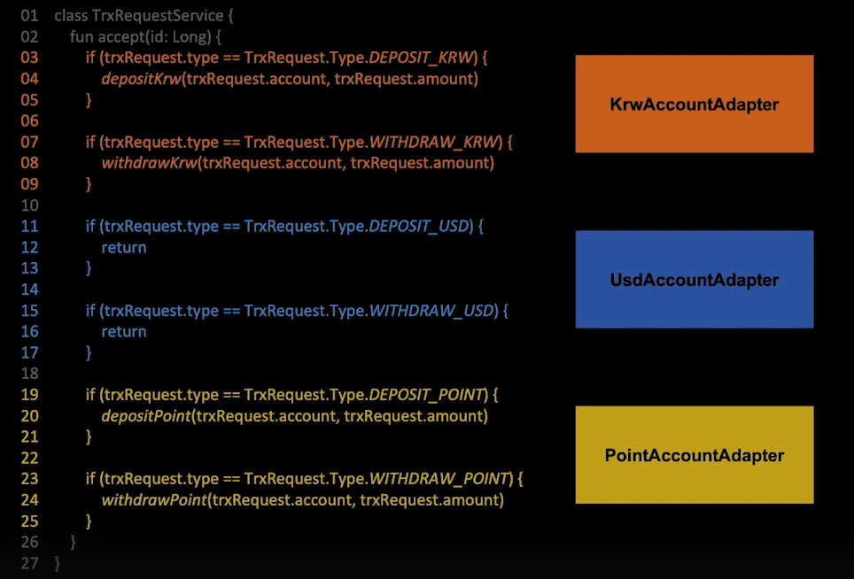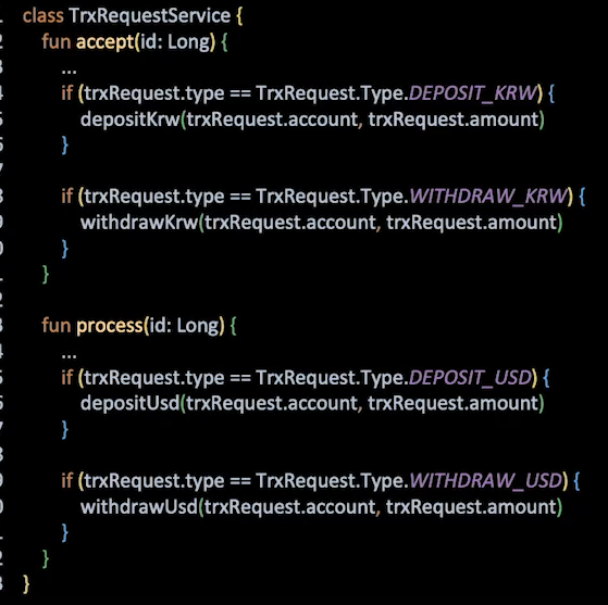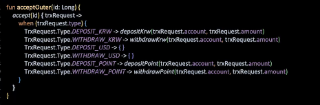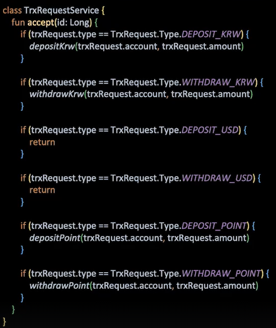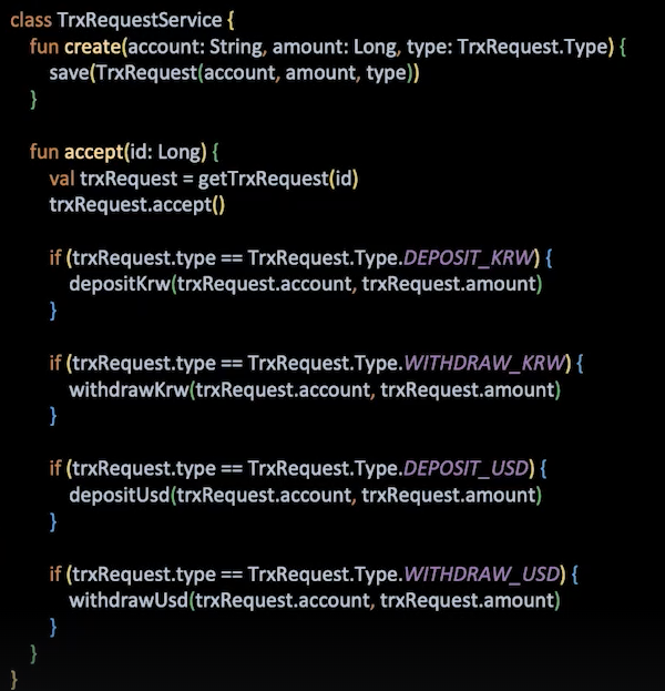 원화 입금, 원화 출금, 달러 입금, 달러 출금이라는 타입으로 enum을 만들어서 if문을 통해 분기를 수행할 수 있습니다.