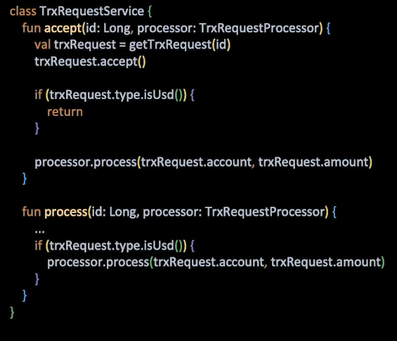 이제 다시 미국 계좌는 승인과 처리를 분리해야 한다는 요구사항을 처리해 보면 분기는 들어갈 수 있지만 인터페이스의 변경 없이 요구사항에 대응할 수 있습니다.