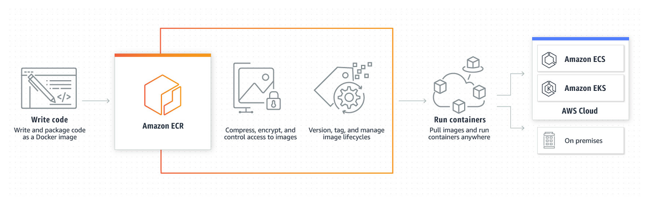 코드를 작성하고 Docker Image로 만들기 -> Amazon ECR에 저장 -> 이미지를 가져와 ECS, EKS, On-Premise 등에서 어느 곳이던 실행
