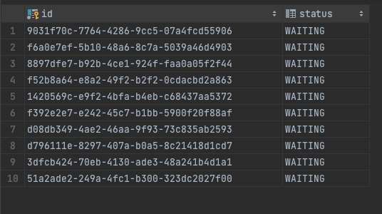 @Table(name = "test_table") @Entity class TestJpaEntity( @Id val id: UUID = UUID.randomUUID(), @Enumerated(EnumType.STRING) var status: TestStatus = TestStatus.WAITING, @Column val createdAt: Instant = Instant.now(), ) enum class TestStatus{ WAITING, READY, COMPLETE } interface TestJpaEntityRepository: JpaRepository<TestJpaEntity, UUID> { } @Component class InitDatabase( private val testJpaEntityRepository: TestJpaEntityRepository, ): ApplicationRunner { override fun run(args: ApplicationArguments) { repeat(10){ testJpaEntityRepository.save(TestJpaEntity()) } println() } }JpaEntity와 Repository를 만들어주었습니다.