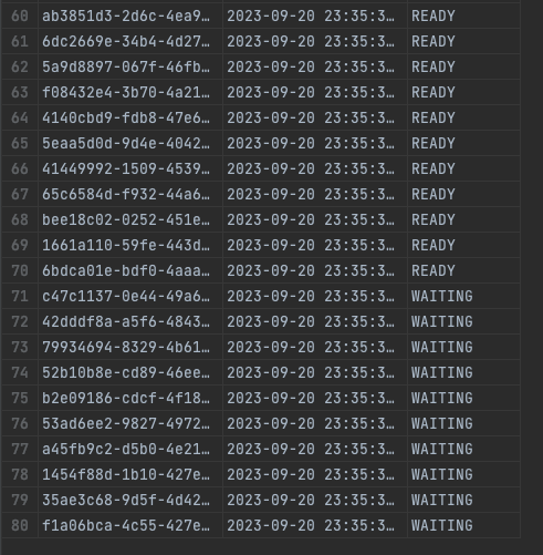 기존에 존재하던 60개의 데이터가 READY상태로 변환되었고, 신규로 10개의 WAITING상태가 만들어졌습니다.