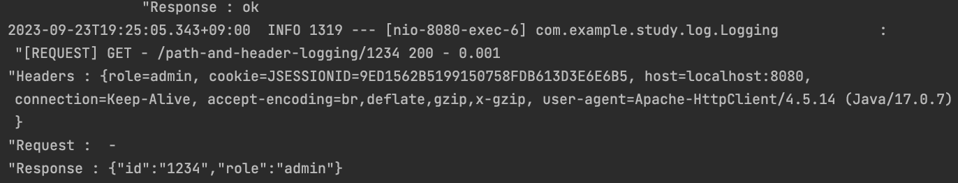 @GetMapping("/path-and-header-logging/{user-id}") fun pathVariableAndHeaderLogging(@RequestHeader role: String, @PathVariable("user-id") id: String): ResponseEntity<TestDTO> { return ResponseEntity.ok( TestDTO( role = role, id = id, ) ) } ### 로깅 테스트 GET localhost:8080/path-and-header-logging/1234 role: admin