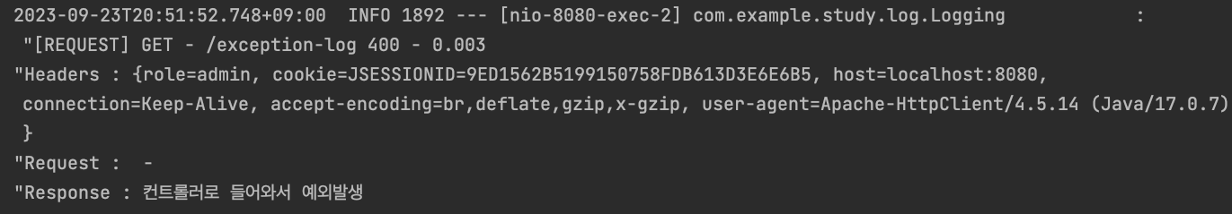 로그 결과 @GetMapping("/exception-log") fun illegalArgumentExceptionLogging() { throw IllegalArgumentException("컨트롤러로 들어와서 예외발생") } ### 로깅 예외 테스트 GET localhost:8080/exception-log role: admin