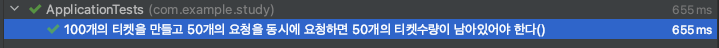 100장의 티켓을 구매하는 여러 스레드의 요청에도 분산락을 통해 예상한 대로 매진 시 0건 이하가 발생하지 않거나 50건의 요청이 있었다면 티켓 50장이 남아있는지 시나리오를 통해 동시성이 잘 제어되는지 확인해보려 합니다.