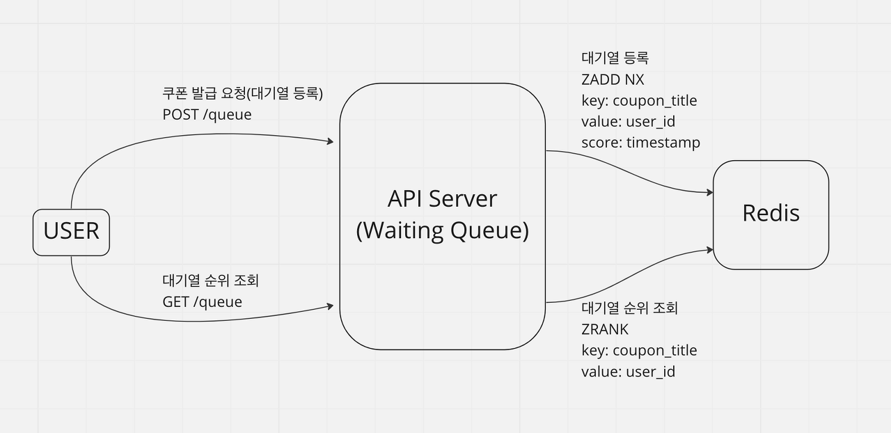 https://jgrammer.tistory.com/entry/Redis%EB%A5%BC-%ED%99%9C%EC%9A%A9%ED%95%9C-%EC%84%A0%EC%B0%A9%EC%88%9C-%EC%BF%A0%ED%8F%B0-%EB%B0%9C%EA%B8%89-%EC%84%9C%EB%B2%84-%EC%84%A4%EA%B3%84 대기열 관련 서버는 등록과 조회에 관한 일만 수행합니다.