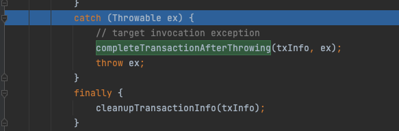 invokeWithinTransaction에서 해당 예외를 잡아 completeTransactionAfterThrowing메서드를 호출한 뒤 다시 예외를 던집니다.
