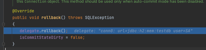 Connection 객체의 타입을 가지는 필드인 delegate의 rollback 메서드를 호출됩니다.
