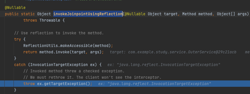 예외가 발생하자 invokeJoinpointUsingReflection 메서드에서 해당 예외를 잡아서 ex.getTargetException을 다시 던집니다.
