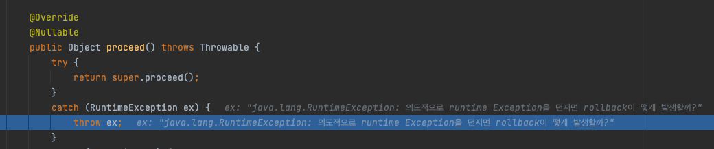 @Transactional fun `의도적으로 예외를 발생시키기`() { testRepository.save(TestEntity(name = "firstSave")) throw RuntimeException("의도적으로 runtime Exception을 던지면 rollback이 떻게 발생할까?") }디버깅을 걸고 추적을 시작합니다.