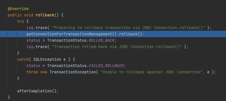 Connection 인터페이스 가져와 rollback을 수행합니다. (이를 통해 실제 Connection이 연관되어 있음을 알 수 있습니다.)