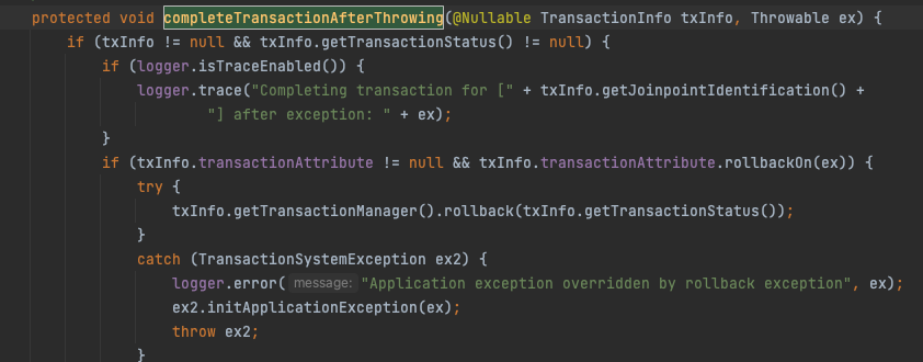 completeTransactionAfterThrowing메서드에서 분기문으로 transactionAttribute.rollbackOn메서드를 호출하여 해당 트랜잭션매니저에게 rollback을 호출할지 결정합니다.