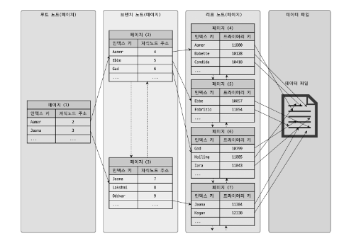 루트노드, 브랜치 노드, 리프 노드로 구성되어 있으며 리프노드에는 실제 데이터 레코드를 찾아가기 위한 주솟값을 가지고 있습니다.