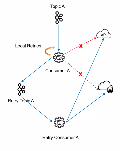 Confluent에서는 이를 Local Retry라고 부르며 N회 재처리를 수행해 보는 전략을 취해볼 수 있습니다.