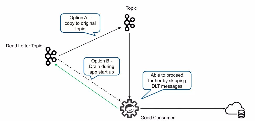 추후에 정상동작을 하도록 변경하고 다시 Topic에 메시지를 발행하거나, Application이 기동 될 때 DTL를 다시 Consuem 합니다.