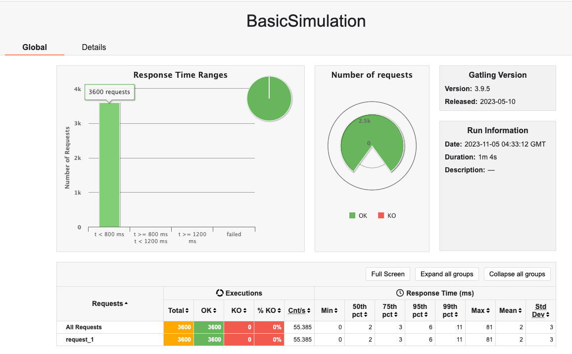================================================================================ 2023-11-05 13:33:22 10s elapsed ---- Requests ------------------------------------------------------------------ > Global (OK=601 KO=0 ) > request_1 (OK=601 KO=0 ) ---- BasicSimulation ----------------------------------------------------------- [######------- ] 8% waiting: 2999 / active: 300 / done: 301 ================================================================================3600번을 호출예시로 하였으며 중간중간 결과가 계속 나옵니다.