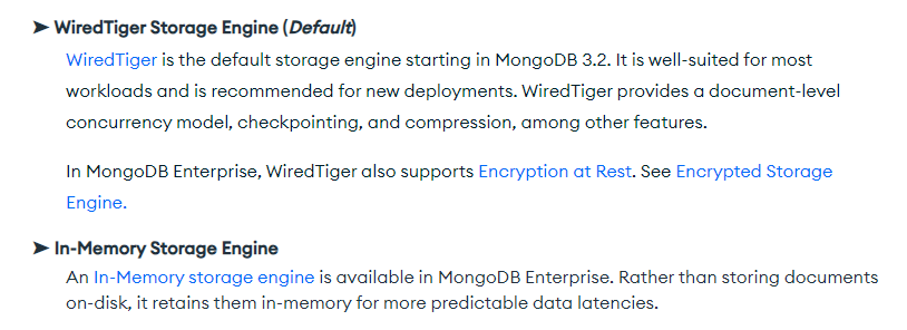 https://www.mongodb.com/docs/manual/core/storage-engines/ MySQL이 여러 Storage Engine을 가지는 것처럼 MongoDB도 여러 개의 Engine을 가지고 현재 기준으로는 WiredTiger Storage Engine가 기본 엔진입니다.