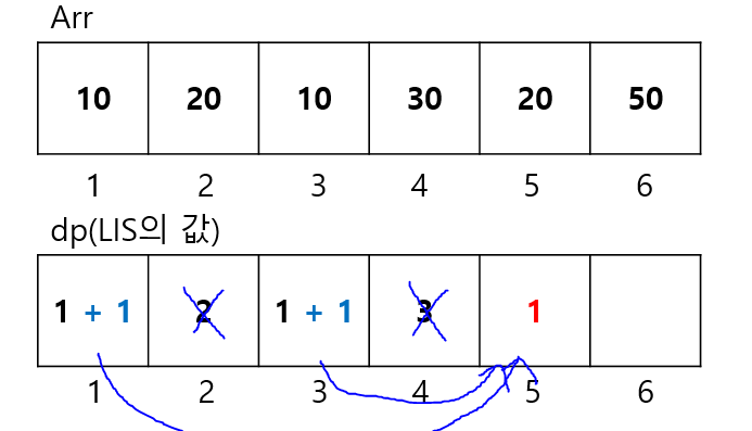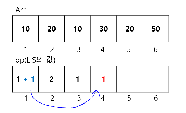 arr[] = {10, 20, 10, 30, 20, 50}위의 배열에 대하여 dp []를 만들어 줍니다.