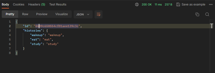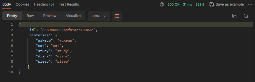 curl --location --request PUT 'http://localhost:8080/members/6589c650554cf81aee139c3c/history' \ --header 'Content-Type: application/json' \ --data '{ "histories": [ "drink","sleep" ] }'