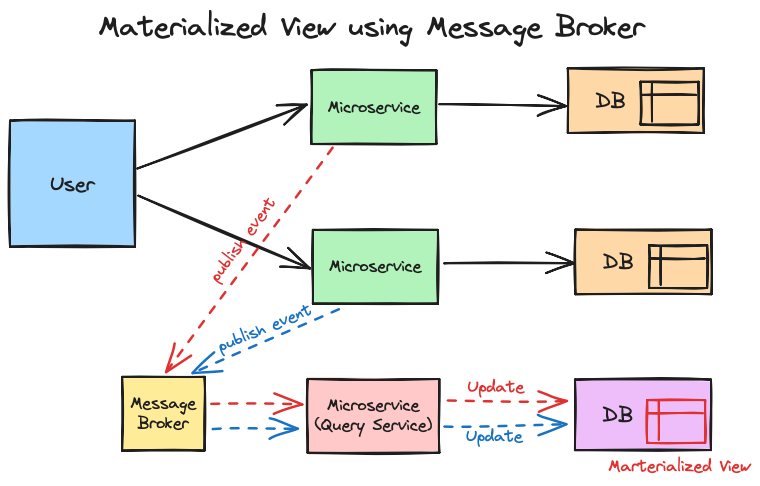 만약 Materialized View 테이블을 만들어내기 위해서 같은 데이터베이스를 바라볼 수 있는 환경이라면 Command 요청이 발생할 때마다 Materizliaed View에 동기화를 수행해 줄 수 있습니다.