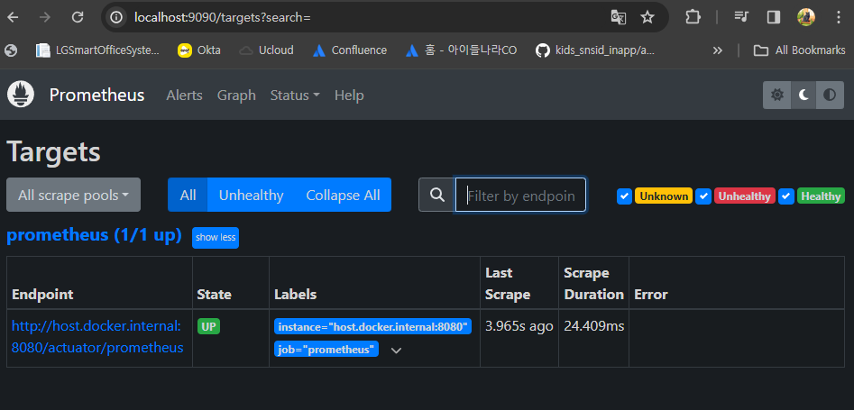 localhost:9090/graph localhost:9090/targets2개의 endpoint에 접근하여 Prometheus가 정상적으로 구동되고 있는지 확인할 수 있습니다.