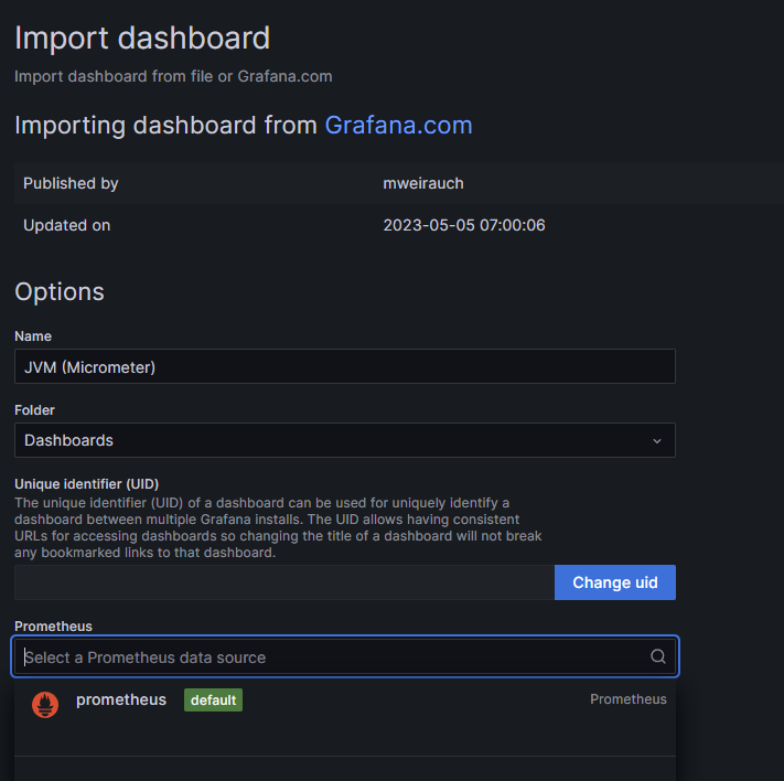 아까 설정했던 prometheus database를 선택해 주고 import를 눌러주면 끝입니다.