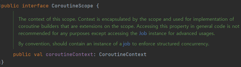 CoroutineScope은 CoroutineContext 하나만 멤버 변수로 정의하고 있는 인터페이스입니다.