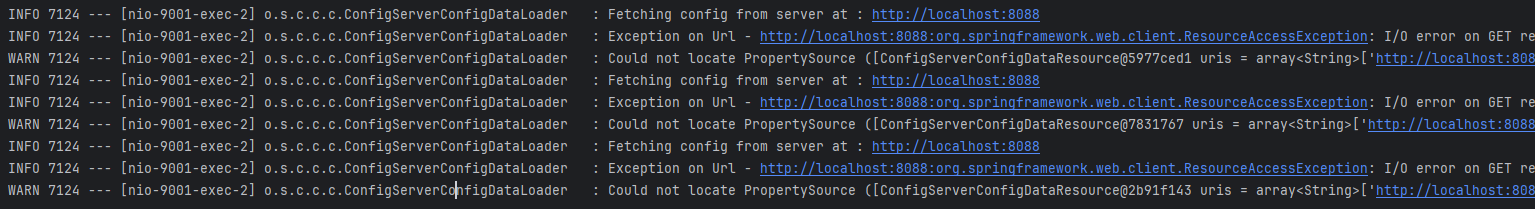 spring.cloud.config.fail-fast=true spring.config.import: optional:configserver:http://localhost:8088optional 부분이 빠져있거나, fail-fase 옵션의 설정이 true 인 경우에는 Config Server가 동작하지 않을 때 Client에 application.yml으로 해당 정보를 지정해 주더라도 Application은 실행되지 않고 바로 예외가 발생합니다.